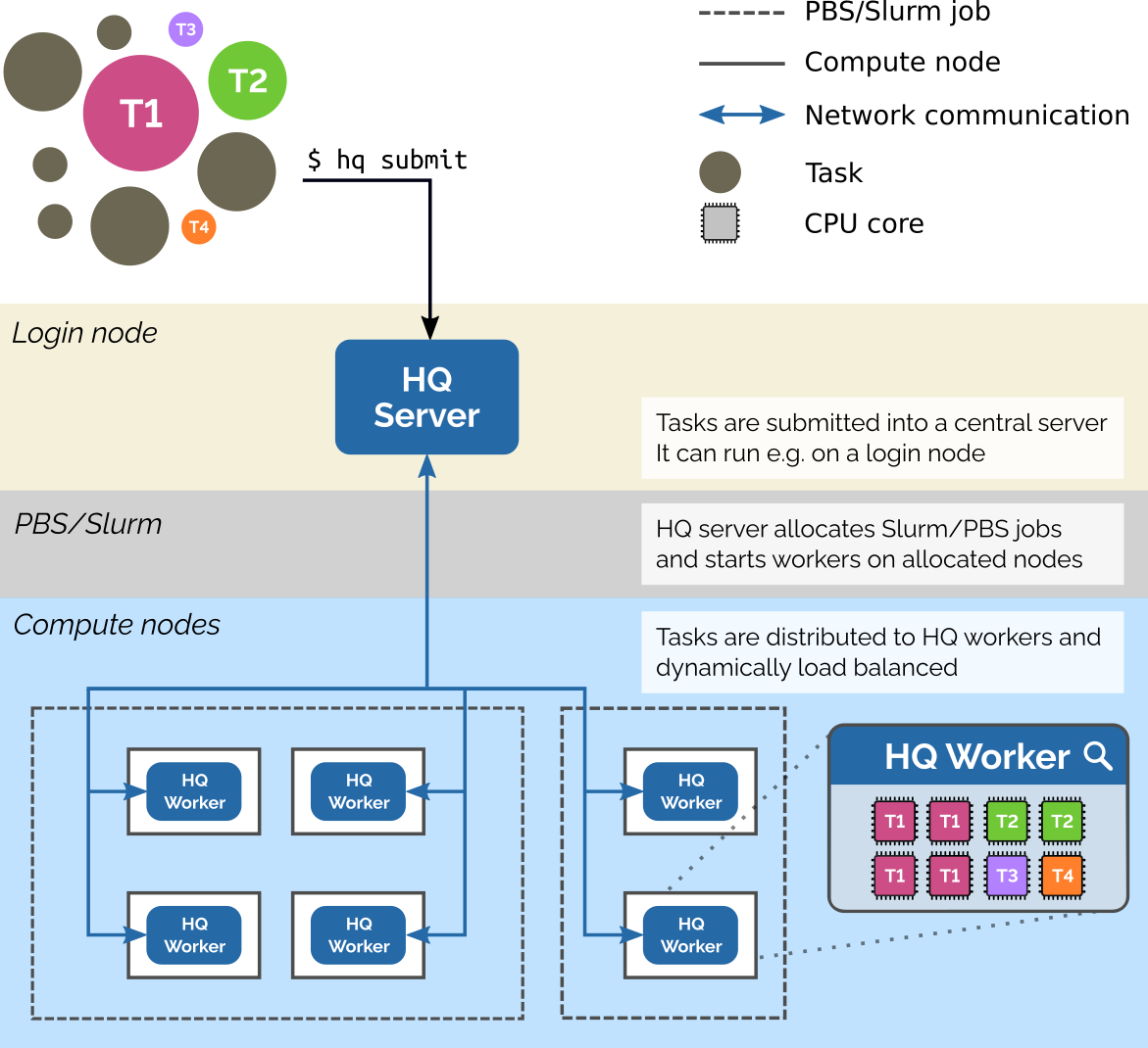 - Server: a long-lived component which can run e.g. on a login node of a computing cluster. It handles task submitted by the user, manages and asks for HPC resources (PBS/Slurm jobs) and distributes tasks to available workers.